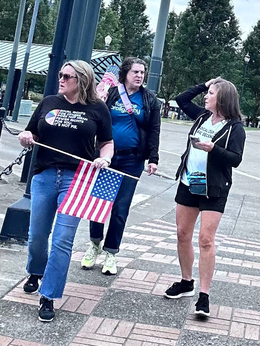These ladies below…I can’t decide what is most cringeworthy. Maybe it’s the fact that one of their shirts says “equal rights for other does not mean fewer rights for you, it’s not pie” while she holds a flag that has never actually been a symbol of a nation that is “indivisible, with liberty and justice for all” or is it the “fuck the broligarchy” the lady with flags plural over her shoulder or the lady with the shirt who’s message is so important she’s got it obscured by her jacket. It might be that none of them are wearing masks or making any attempt to shield their faces or that there’s one of them with her phone out or one with what looks like an apple watch on her wrist. Then again it could also be that two of them are carrying bags on their body and I’d bet inside their bags is id, house and car keys, money, credit cards etc. too.